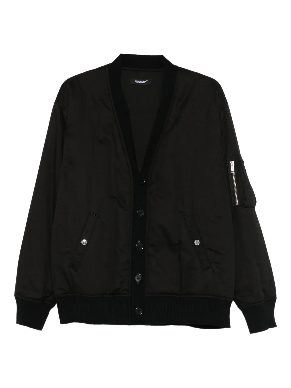 buttoned bomber jacket Highlights - Black - Ribbed hem - Front button fastening - Zip pocket at the sleeve - V-neck Imported Composition Polyester 100%, Cotton 100% Washing instructions Read Manufacturer Guidelines