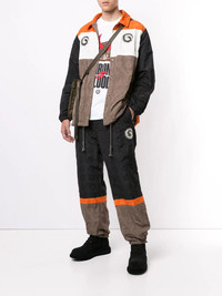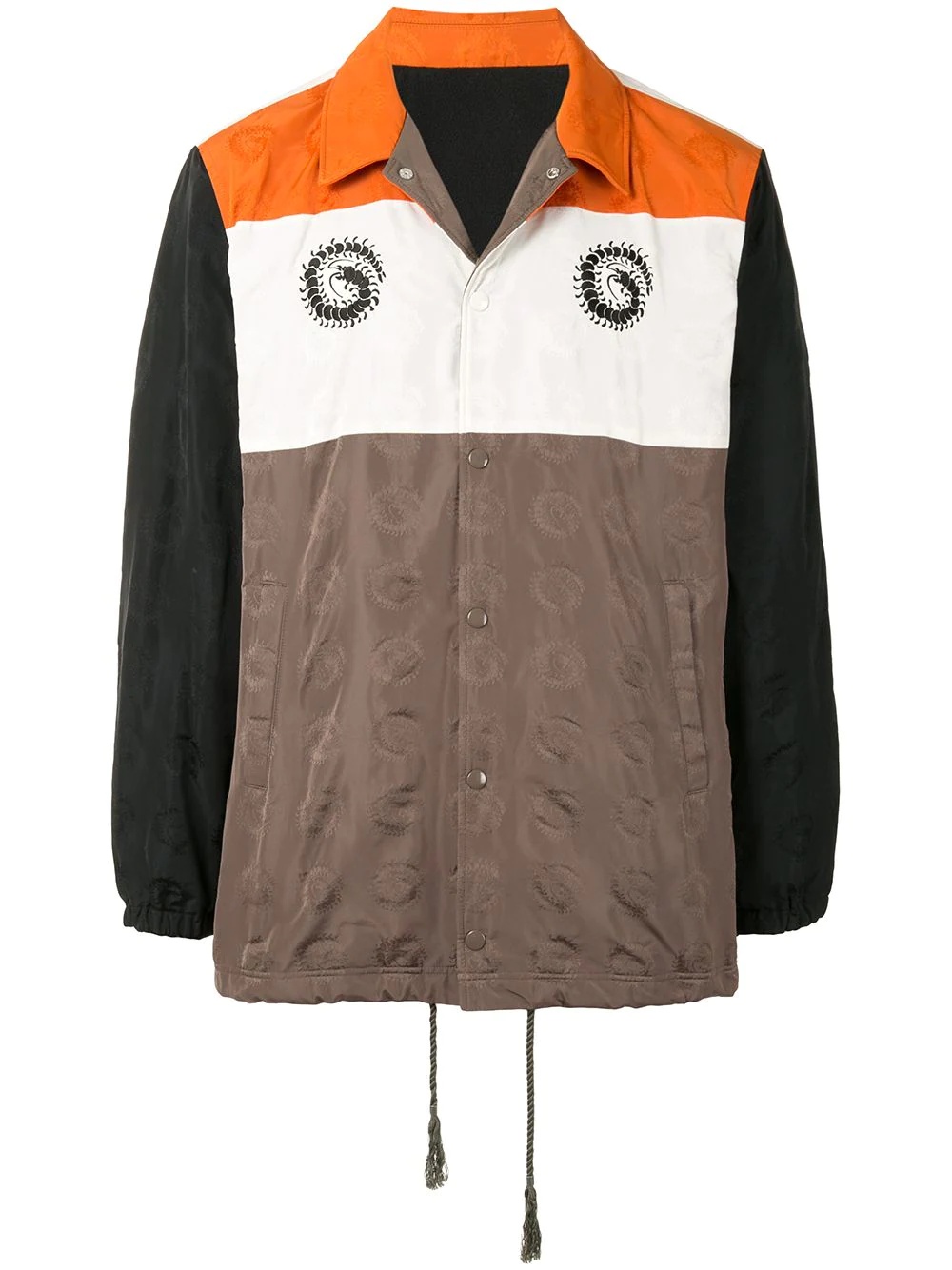 colour-block logo-print jacket black/beige/white straight-point collar front button fastening long sleeves elasticated cuffs two side slit pockets straight hem Imported Composition Polyester 100% SIZE & FIT Model measurements Height 6 ft 0 in(1.83 m) Bust/Chest 37.79 in(96 cm) Hips 37 in(94 cm) Waist 30.31 in(77 cm) FittingInformation This piece fits true to size. We recommend you get your regular size Cut for a loose fit Made with a mid-weight fabric Washing instructions Hand Wash