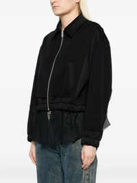elastic-waist zip-front jacket Highlights - Black - Front zip fastening - Sheer overlay Imported Composition Outer: Polyester 100% Polyester 100% SIZE & FIT Model measurements Height 5 ft 9 in(1.76 m) Bust/Chest 31.1 in(79 cm) Hips 35.03 in(89 cm) Waist 24.4 in(62 cm) FittingInformation Designed to be unstructured, offering a loose fit throughout The elasticated hem allows for movement and a comfortable fit Made from a midweight non-stretch fabric Washing instructions Dry Clean Only