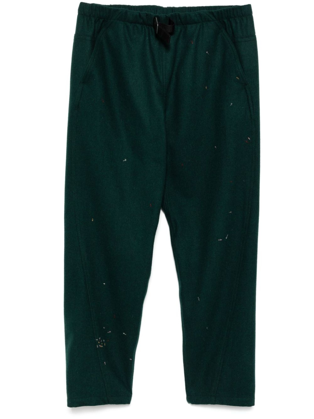 embroidered pants Highlights - Dark green - Belted waist - Two side slash pockets - Two rear touch-strap fastening pockets Imported Composition Wool 67%, Polyester 22%, Nylon 6%, Acrylic 5% SIZE & FIT Model measurements Height 6 ft 1 in(1.85 m) Bust/Chest 35.43 in(90 cm) Hips 36.22 in(92 cm) Waist 28.74 in(73 cm) FittingInformation Designed for a tapered leg, offering a loose unrestricted fit over the leg with a closer fit towards the ankle The elasticated waist allows for a comfortable fit Made from a midweight non-stretch fabric