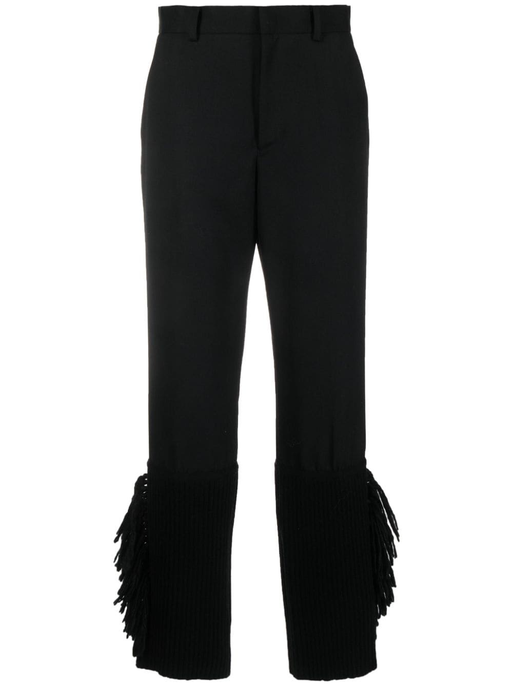 frayed-trim cropped trousers Highlights - Black - Wool - Bemberg™ cupro - Knitted panels - Frayed detailing - High waist - Belt loops - Concealed front fastening - Straight leg - Cropped - Two side inset pockets - Rear button-fastening jetted pocket - Rear flap pocket Imported Composition Outer: Wool 100% Lining: Cupro 100% SIZE & FIT Model measurements Height 5 ft 10 in(1.78 m) Bust/Chest 33.07 in(84 cm) Hips 36.61 in(93 cm) Waist 24.8 in(63 cm) FittingInformation Designed for a tapered fit, these trousers allow for a close fit at the waist and a loose unrestricted fit over the leg with a closer fit towards the ankle Made from a midweight non-stretch fabric This piece fits true to size – take your usual size Washing instructions Dry Clean Only