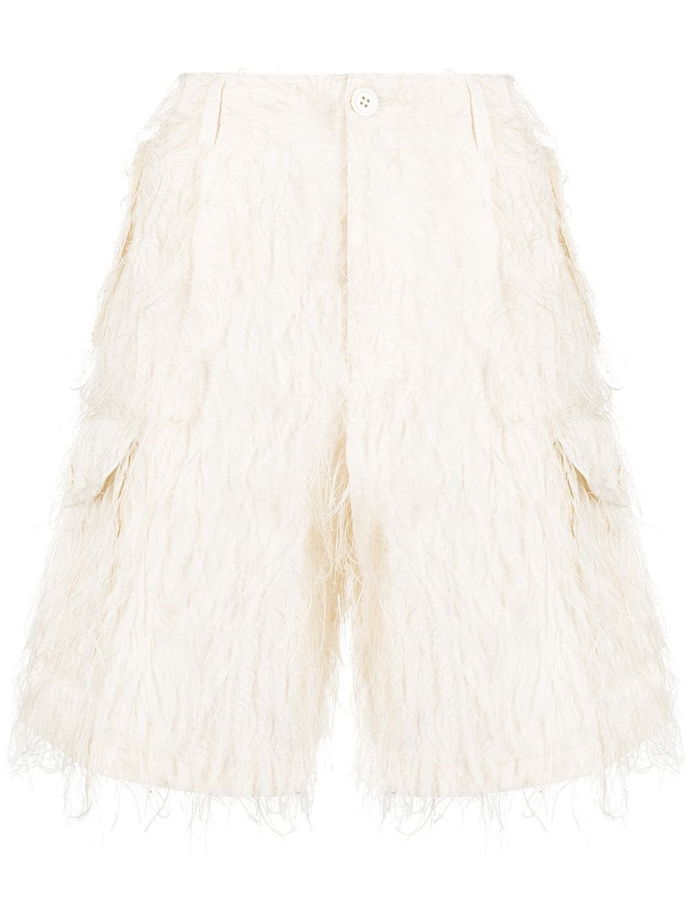 fringed cargo shorts Undercover is a Japanese clothing brand founded by Jun Takahashi in 1993 influenced by street culture. Following the brand's casual aesthetic, these cargo shorts follow a classic silhouette and are updated with tonal fringe detailing. Imported Composition Outer: Polyester 56%, Cotton 44% Lining: Polyester 100% SIZE & FIT Model measurements Height 5 ft 10 in(1.78 m) Bust/Chest 30.31 in(77 cm) Hips 34.64 in(88 cm) Waist 25.59 in(65 cm) FittingInformation This piece fits true to size. We recommend you get your regular size Designed to be fitted at the waist, loose over the leg Made with a mid-weight non-stretch fabric