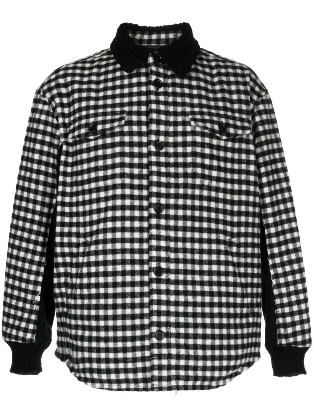 gingham-check flannel shirt jacket Highlights - Black/white - Wool blend/wool/cotton/mohair-wool blend - Flannel - Gingham check pattern - Faux-shearling trim - Classic collar - Front button fastening - Drop shoulder - Long sleeves - Ribbed cuffs - Two chest flap pockets - Two front welt pockets - Curved hem - Quilted lining Imported Composition Base: Acrylic 65%, Polyester 35% Body: Wool 70%, Nylon 30% Outer: Wool 100% Filling: Polyester 100% Lining: Cupro 100% Front: Cotton 100% Trims: Cotton 100%, Mohair 55%, Nylon 30%, Wool 15% SIZE & FIT Model measurements Height 6 ft 2 in(1.87 m) Bust/Chest 33.07 in(84 cm) Hips 35.43 in(90 cm) Waist 26.77 in(68 cm) FittingInformation Designed for a boxy fit, intended for a loose fit throughout Made from a padded non-stretch fabric, giving it no natural elasticity This piece fits true to size – take your usual size