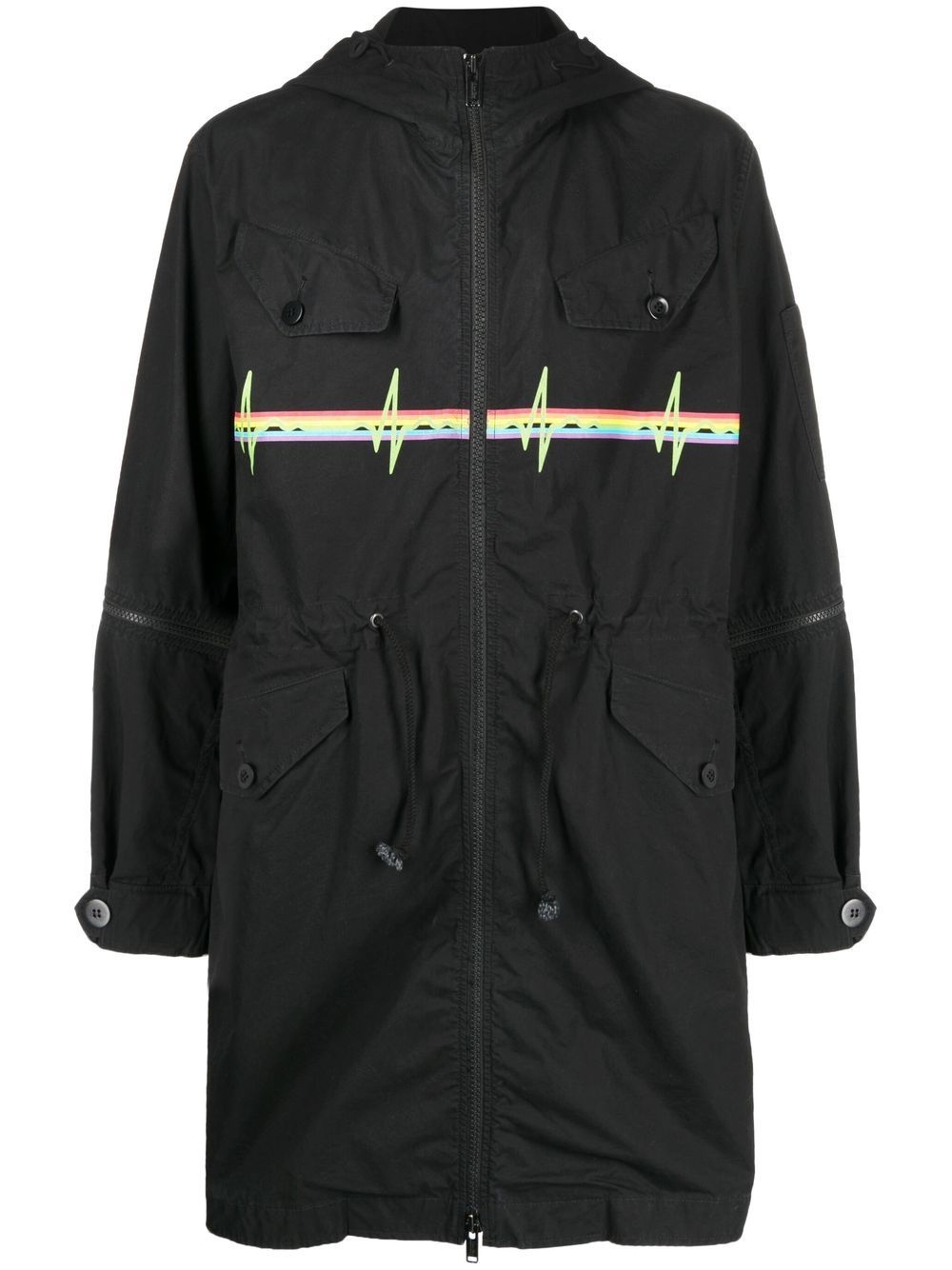 graphic-print hooded parka black cotton all-over graphic print classic hood front zip fastening long sleeves two chest flap pockets two front flap pockets straight hem Imported Composition Cotton 100% SIZE & FIT Model measurements Height 6 ft 3 in(1.9 m) Bust/Chest 34.64 in(88 cm) Hips 36.61 in(93 cm) Waist 27.55 in(70 cm) FittingInformation This piece fits true to size. We recommend you get your regular size Cut for a loose fit Made with a mid-weight fabric Washing instructions Machine Wash