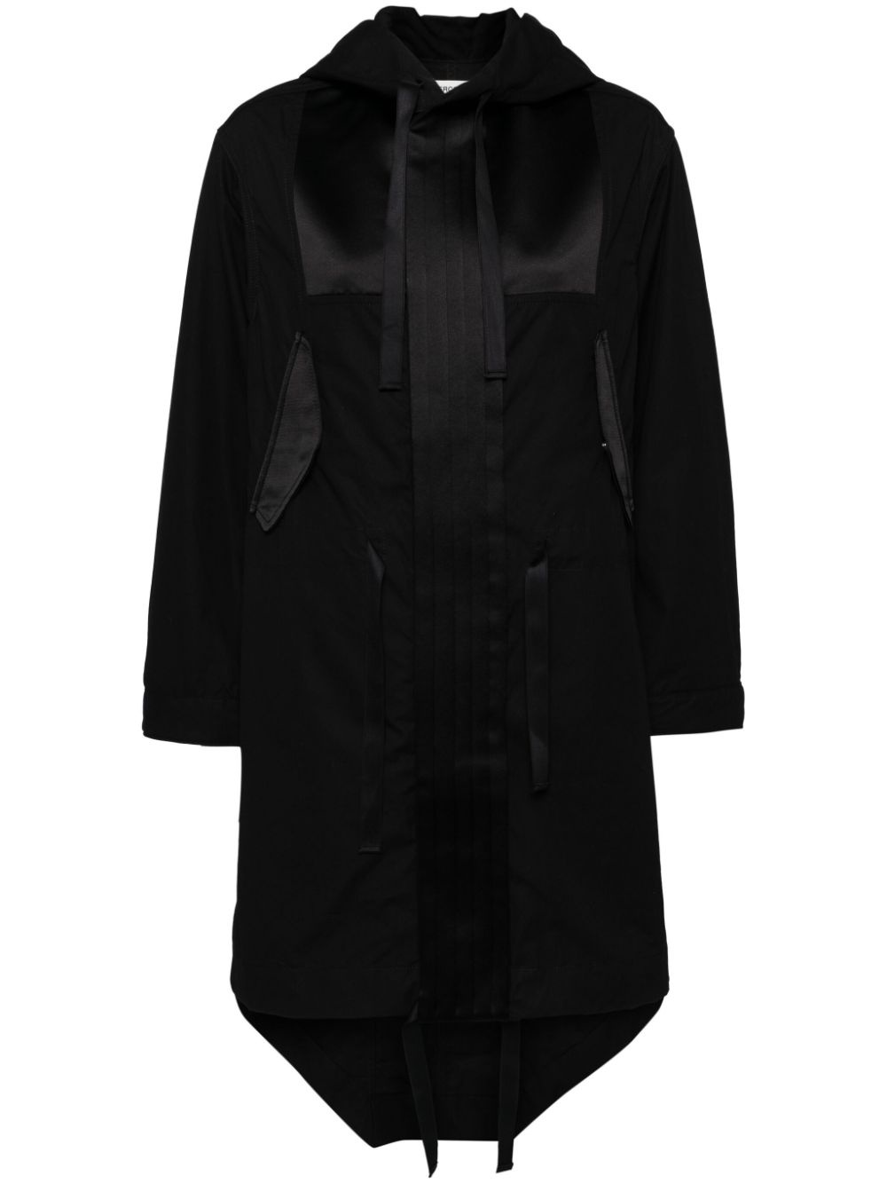 hooded parka coat Highlights - Black - Cotton - Satin panelling - Decorative button detailing - Drawstring hood - Front press-stud and zip fastening - Two side flap pockets - Drawstring waist - Long sleeves - Buttoned cuffs - Drawstring hem - Mid-length Imported Composition Cotton 100% Trims: Polyester 100%