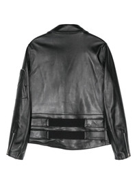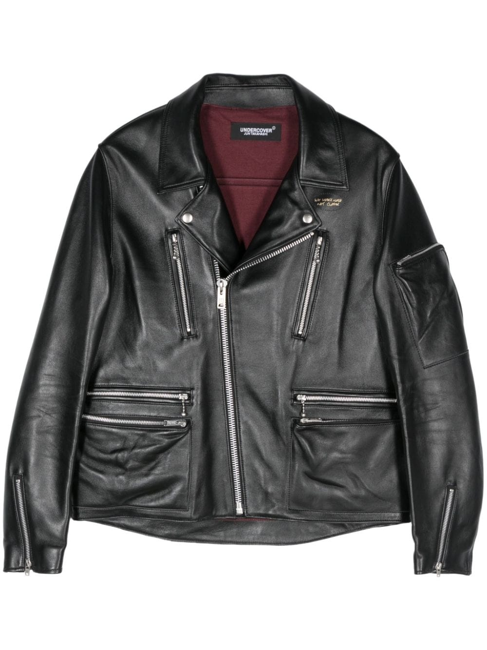 leather biker jacket Highlights - Black - Sheepskin - Front zip fastening - Notched collar - Long sleeves - Sleeve zip pocket - Cuff zips - Slogan print - Two zip-fastening chest pockets - Multiple side zip pockets - Full lining - Straight hem Imported Composition Lining: Cotton 100%, Cupro 100% Outer: Sheepskin 100% Washing instructions Do Not Wash/Do Not Dry Clean