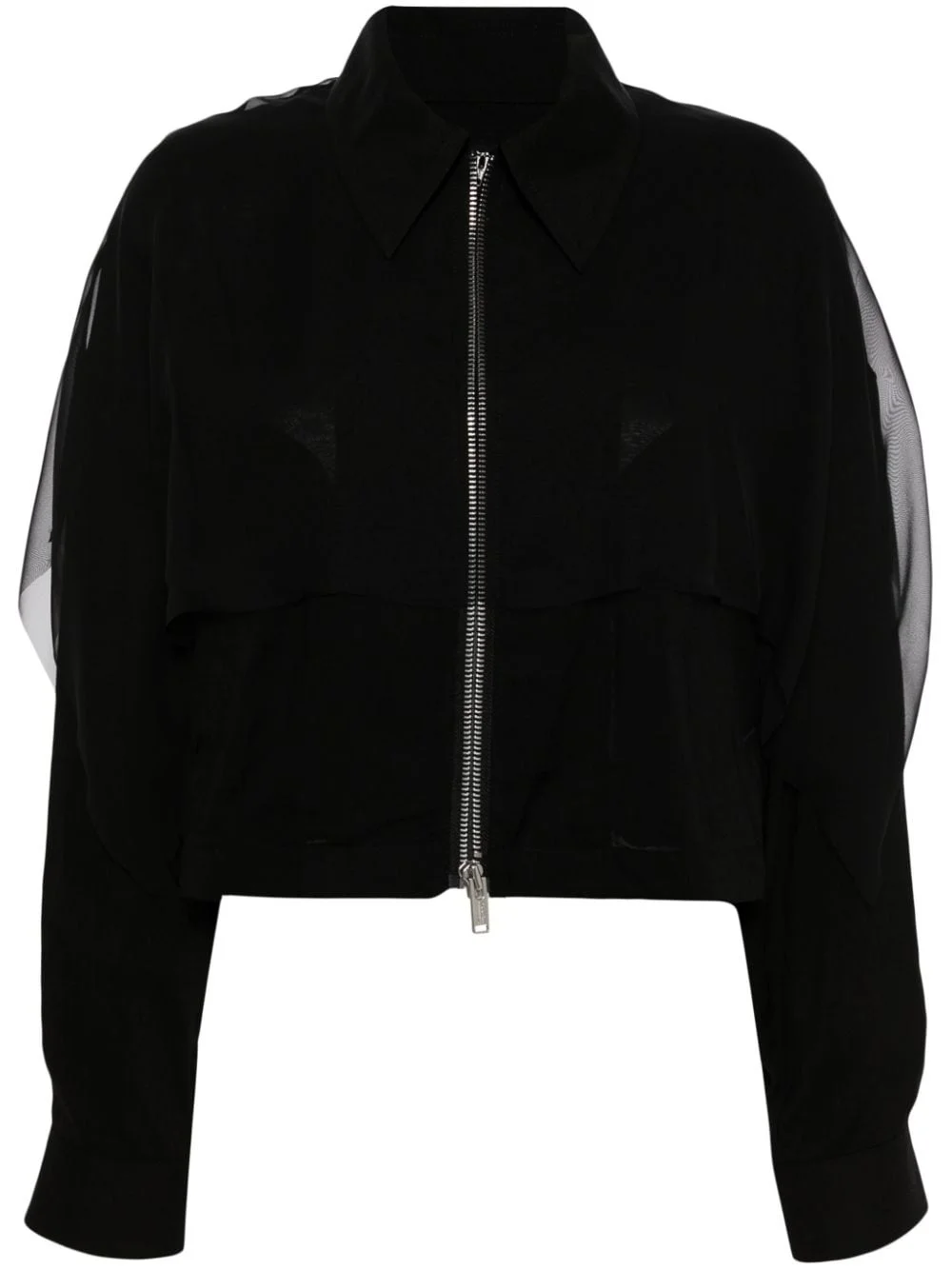 logo-patch layered jacket Highlights - Black - Semi-sheer construction - Pointed collar - Long sleeves - Buttoned cuffs - Layered effect - Two side welt pockets - Logo patch to the rear - Open back - Front zip fastening Imported Composition Body: Rayon 100% Outer: Polyester 100% Washing instructions Dry Clean Only