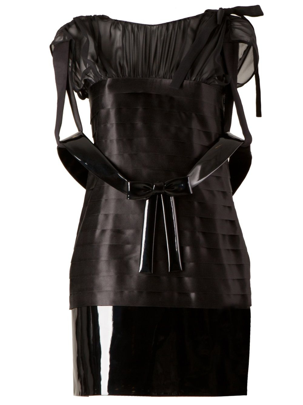 oversized dres Black silk and cotton oversized dres from Undercover featuring a round neck, a sleeveless design, sheer panels, a belted silhouette, a bow detail, a varnished detail and a short length. Imported Composition Polyester 100%, Polyurethane 100%, Cotton 100%, Silk 100% Lining: Cupro 100% Washing instructions Dry Clean Only