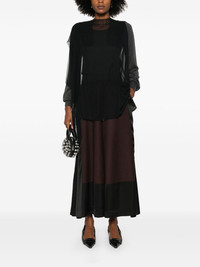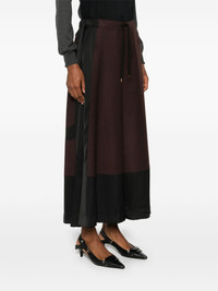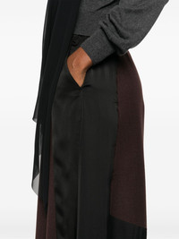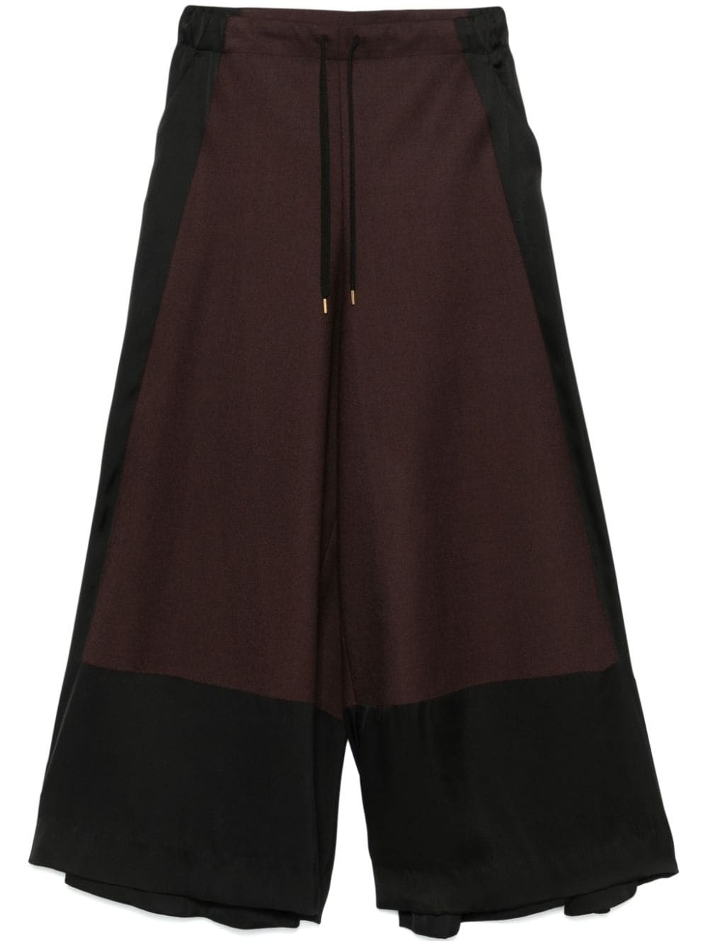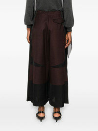 panelled trousers Highlights - Brown/black - Wool blend - Satin weave - Palazzo design - Panelled design - Elasticated drawstring waistband - High waist - Two side slash pockets - Rear flap pocket - Cropped Imported Composition Polyester 100%, Wool 98%, Polyurethane 2% SIZE & FIT Model measurements Height 5 ft 11 in(1.8 m) Bust/Chest 32.67 in(83 cm) Hips 35.82 in(91 cm) Waist 25.98 in(66 cm) FittingInformation Designed with a wide-leg cut, these trousers allow for a close fit at the waist and offer a loose and roomy fit over the leg The elasticated waist allows for a comfortable fit Made from a midweight non-stretch fabric Washing instructions Do Not Wash/Do Not Dry Clean