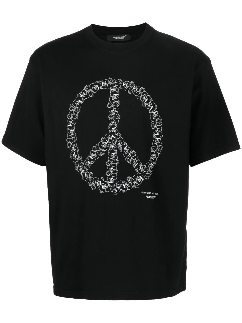 peace-sign cotton T-Shirt black cotton jersey knit peace sign motif crew neck short sleeves straight hem Imported Composition Cotton 100% SIZE & FIT Model measurements Height 6 ft 3 in(1.9 m) Bust/Chest 34.64 in(88 cm) Hips 36.61 in(93 cm) Waist 27.55 in(70 cm) FittingInformation This piece fits true to size. We recommend you get your regular size Cut for a relaxed fit Made with a mid-weight fabric Washing instructions Machine Wash