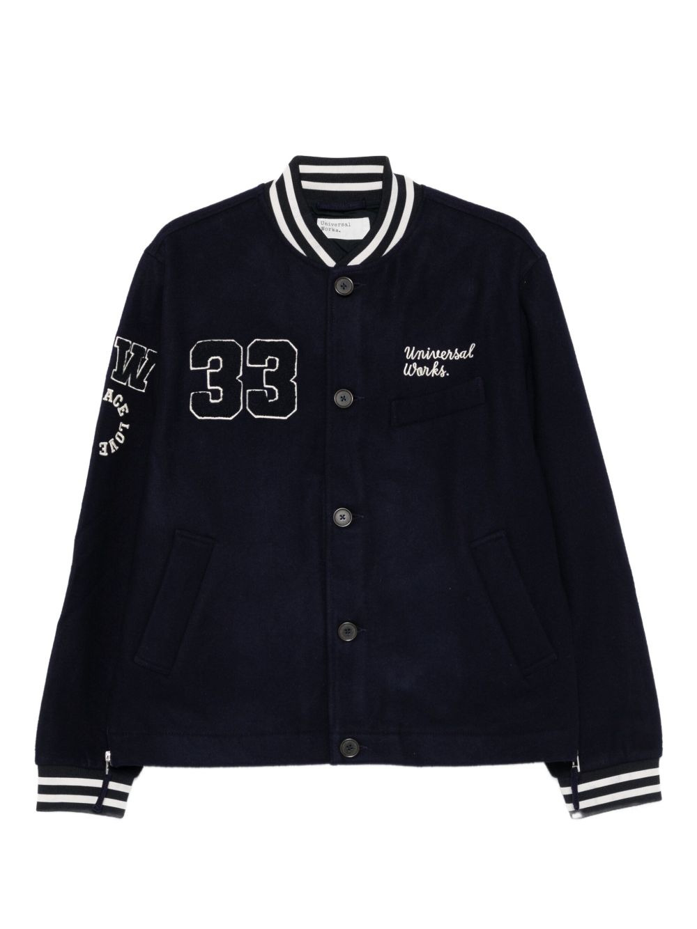 number-embroidered ribbed-cuff jacket Highlights - Navy blue - Number embroidery - Ribbed cuffs - Front button fastening - Side welt pockets Imported Composition Wool 75%, Polyamide 25% SIZE & FIT Model measurements Height 6 ft 0 in(1.84 m) Bust/Chest 35.82 in(91 cm) Hips 37 in(94 cm) Waist 28.34 in(72 cm) Washing instructions Dry Clean Only