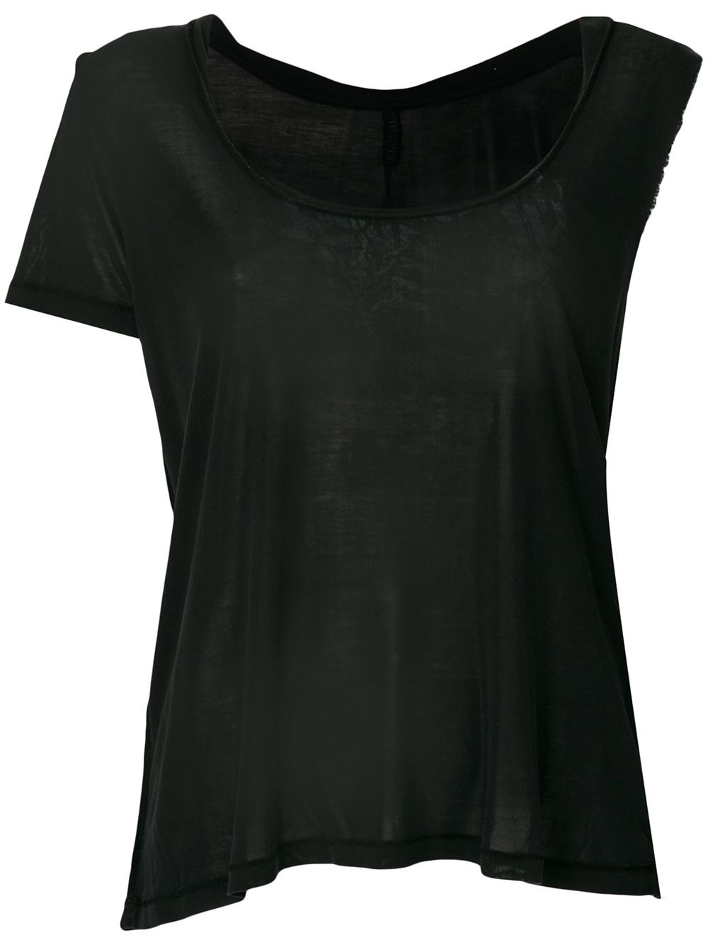 asymmetric sleeve twisted scoop neck tank Black silk asymmetric sleeve twisted scoop neck tank with placement print detail from Unravel. Made in Italy Composition Silk 100% SIZE & FIT Model measurements Height 5 ft 10 in(1.79 m) Bust/Chest 33.07 in(84 cm) Hips 35.82 in(91 cm) Waist 24.8 in(63 cm) Washing instructions Dry Clean Only