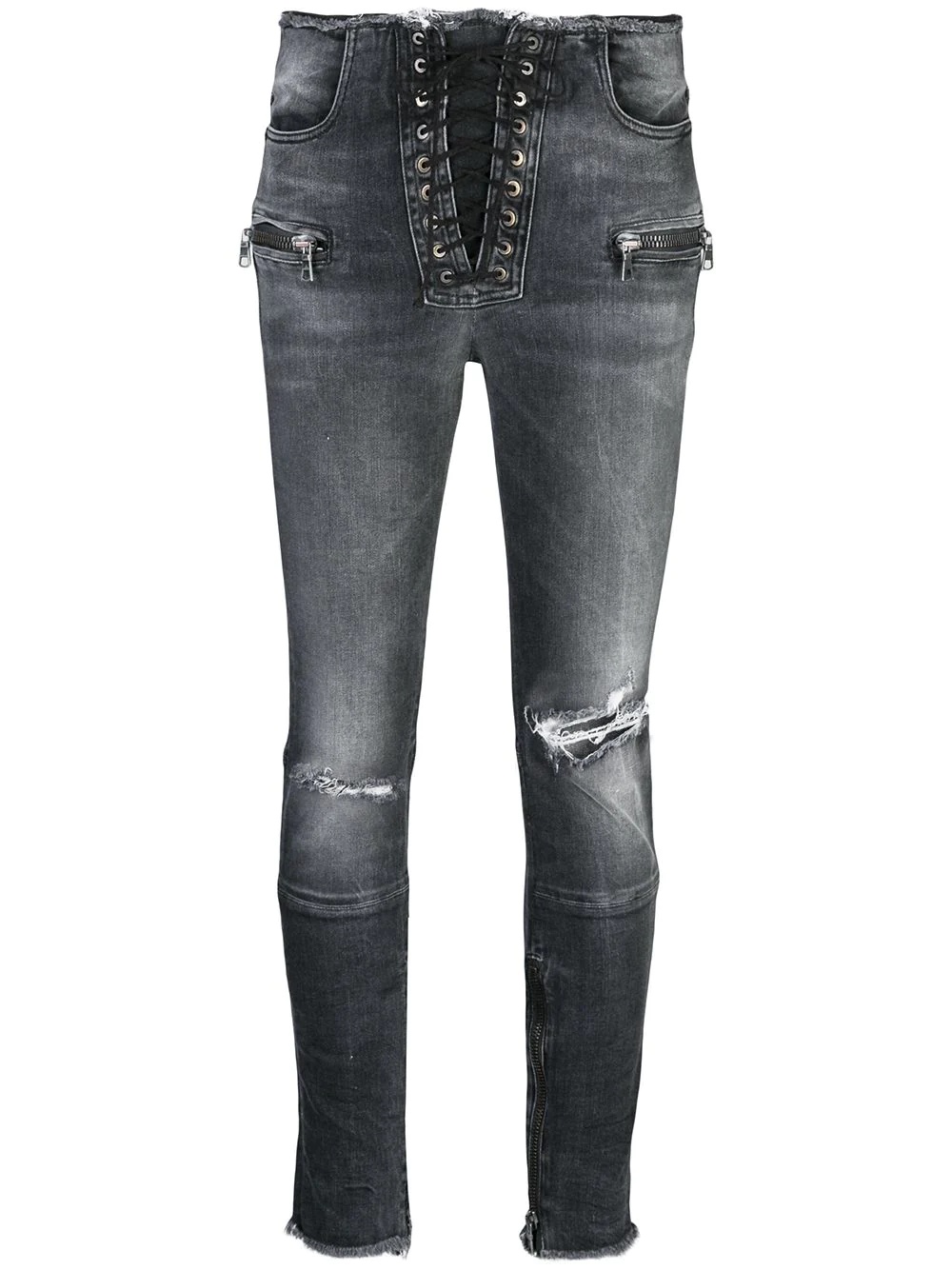distressed skinny jeans Black cotton blend distressed skinny jeans from Unravel featuring a mid rise, a lace fastening, side pockets, rear pockets, a skinny fit and a distressed finish. Made in Italy Composition Cotton 92%, Elastodiene 6%, Spandex/Elastane 2%