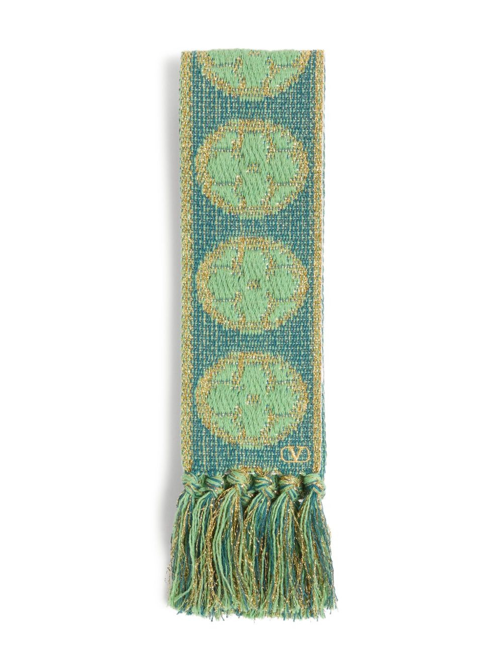 Antibes scarf Highlights - Green - Cotton blend - Patterned jacquard - Metallic threading - Embroidered logo - Fringed edge Made in Italy Composition Cotton 80%, Metallic Fibre 20% SIZE & FIT Measurement LENGTH 70.86 in(180 cm) WIDTH 2.75 in(7 cm)