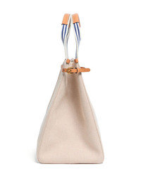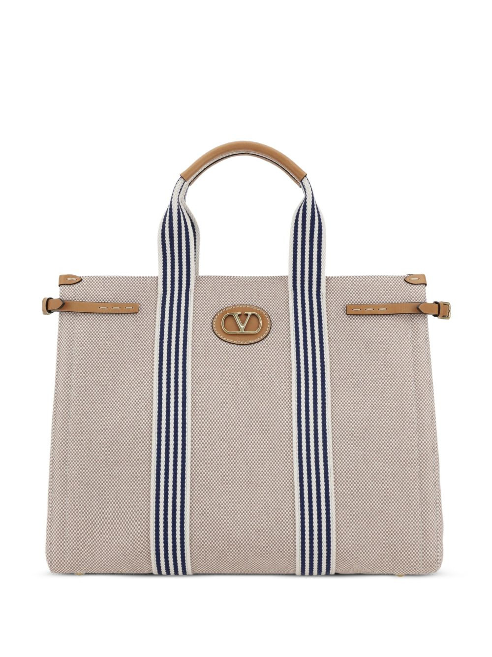 Antibes tote bag Highlights - Beige - Cotton - Leather - Vlogo signature - Concealed magnetic fastening - Two top handles - Stripe detailing - Main compartment - Internal zip-fastening pocket Made in Italy Composition Lining: Cotton 67%, Linen/Flax 33% Outer: Calf Leather 100%, Cotton 100%, Metal 100% SIZE & FIT Measurement DEPTH 7.87 in(20 cm) HANDLE 5.51 in(14 cm) HEIGHT 12.99 in(33 cm) WIDTH 16.14 in(41 cm)