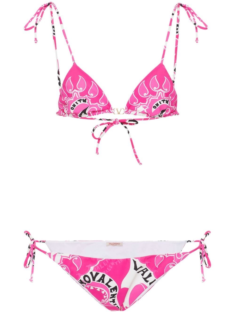 Archive Manifesto bikini set Valentino Garavani's Archive Manifesto Bandana pattern decorates both pieces of this bikini set, nodding to the Italian house's penchant for brand-focused designs. The signature print is here seen in an alternative fuchsia pink colourway, instead of the usual red hue. Highlights - Valentino ready to wear - Fuchsia pink/multicolour - Stretch-design - All-over graphic print - The full look includes valentino garavani accessories. - Top: - Valentino ready to wear - Triangle cup - Vlogo signature - Tie-fastening straps - Rear lace-up fastening - The full look includes valentino garavani accessories. - Bottom: - Valentino ready to wear - Low-rise - Side lace-up fastening - Be mindful to try on swimwear over your own garments. - The full look includes valentino garavani accessories. Made in Italy Composition Outer: Polyamide 71%, Elastane 29% Lining: Polyamide 73%, Elastane 27% Washing instructions Read Manufacturer Guidelines