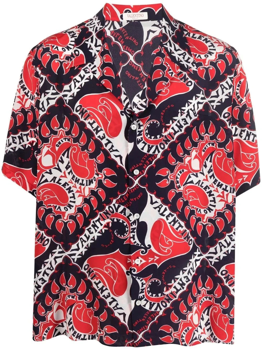 bandana-print short-sleeve silk shirt Printed throughout with Valentino Garavani's Archive Manifesto Bandana pattern, this short-sleeve shirt is crafted in a sleek silk fabrication. Highlights - Valentino ready to wear - Navy blue/red/white - Silk - Bandana print - Short sleeves - Chest welt pocket - Front button fastening Made in Italy Composition Silk 100% SIZE & FIT Model measurements Height 6 ft 2 in(1.88 m) Bust/Chest 36.61 in(93 cm) Hips 35.82 in(91 cm) Waist 27.95 in(71 cm) Measurement Shoulder Width 7.08 in(18 cm) Washing instructions Read Manufacturer Guidelines