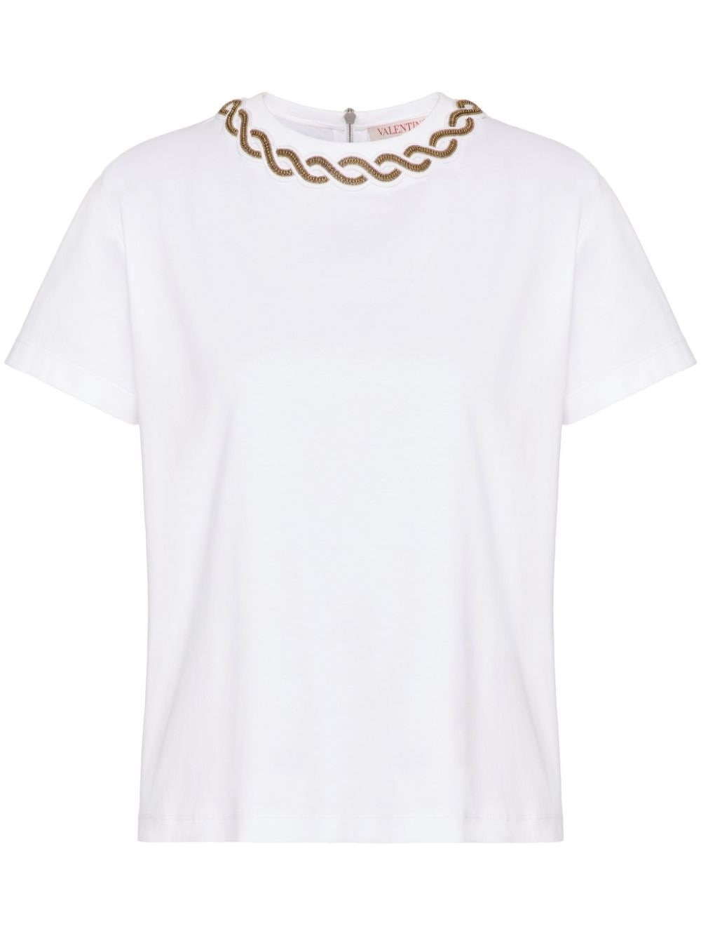 bead-trim cotton T-shirt Highlights - White - Cotton - Bead embellishment - Round neck - Short sleeves - Straight hem - Rear zip fastening - The full look includes valentino garavani accessories. - The model is 176 cm / 5'9'' tall and wears an italian size s Made in Italy Composition Polyester 100%, Cotton 100% Washing instructions Read Manufacturer Guidelines