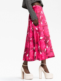 blurred rose-print skirt Defined by its vibrant blurred rose print, this hot-pink skirt from Valentino Garavani spotlights the Italian label's bolder side. It's cut to a high-waisted, A-line silhouette that's designed to finish at the mid-calf. Highlights - Valentino garavani ready to wear - Fuchsia pink - White - All-over rose print - High-waisted - Concealed side zip fastening - A-line - Mid-length Made in Italy Composition Outer: Polyester 90%, Silk 10% Lining: Silk 100% SIZE & FIT Model measurements Height 5 ft 10 in(1.77 m) Bust/Chest 32.28 in(82 cm) Hips 35.03 in(89 cm) Waist 25.19 in(64 cm) Measurement HIPS 43.3 in(110 cm) LENGTH 34.25 in(87 cm) WAIST 29.13 in(74 cm) FittingInformation This midi-length skirt is intended to be worn just below the waist Made from a midweight non-stretch fabric This piece fits true to size – take your usual size Washing instructions Dry Clean Only