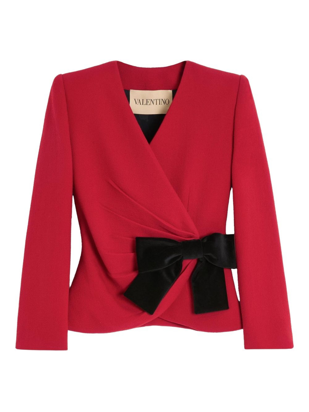 bow-detail crepe blazer Highlights - Valentino ready to wear - Red - Wool crepe - Ruched waist - Shoulder pads - Crossover front - Snap button closure Made in Italy Composition Outer: Virgin Wool 100% Lining: Acetate 75%, Silk 25% Washing instructions Read Manufacturer Guidelines