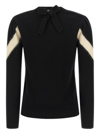 bow-detail sweater Highlights - Black and white - V-neck - Bow detail to the back - Metallic v logo detail - Cuffed sleeves Made in Italy Composition Virgin Wool 100% Washing instructions Read Manufacturer Guidelines