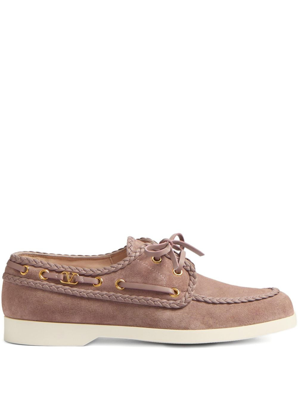 palm avenue crust nappa leather boat shoes Highlights - Powder pink - Front lace-up fastening - Vlogo signature in antique-brass finish - Branded insole - Contrasting trim - Strap detailing Made in Italy Composition Outer: Calf Suede 100% Lining: Goat Skin 100% Sole: Rubber 100%