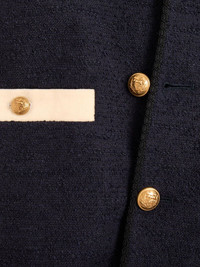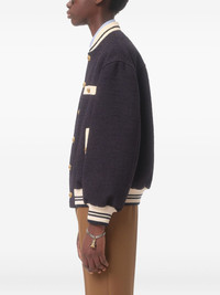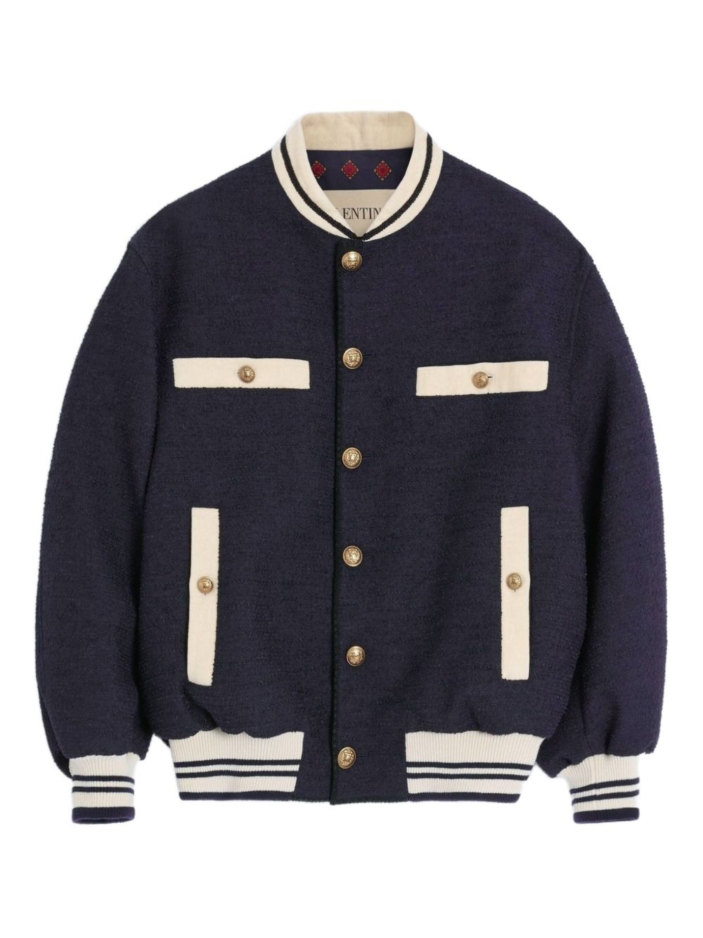button-up varsity jacket Highlights - Navy blue - Contrasting cream detailing - Button fastenings - Ribbed collar - Patch pockets Made in Italy Composition Cotton 31%, Viscose 31%, Wool 18%, Fabric 11%, Polyamide 9% Washing instructions Read Manufacturer Guidelines