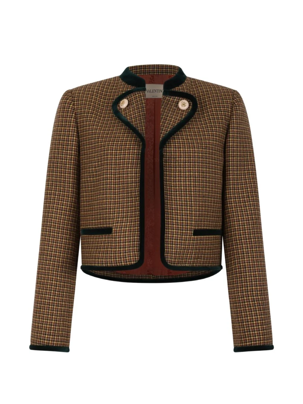 Cropped Velvet-trimmed Houndstooth Wool Jacket