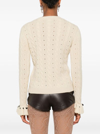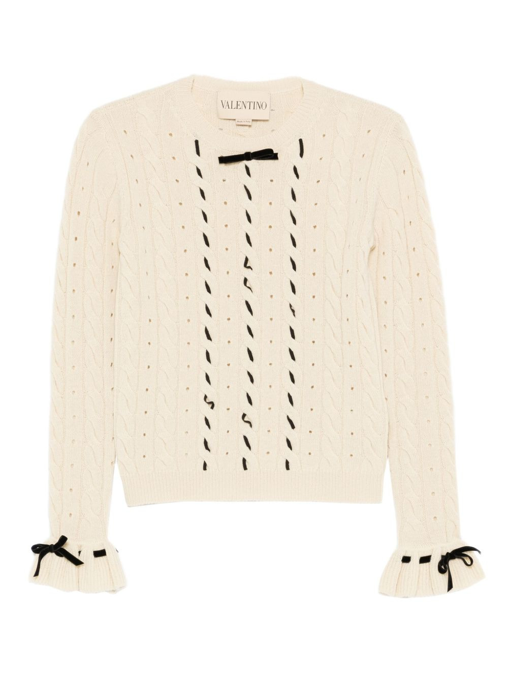 cable-knit ruffled-cuff sweater Highlights - Beige - Cable knit - Black ribbon detail - Ruffled cuffs - Bow embellishment - Eyelet detail Made in Italy Composition Virgin Wool 100%, Cotton 56%, Viscose 44% SIZE & FIT Model measurements Height 5 ft 10 in(1.77 m) Bust/Chest 33.07 in(84 cm) Hips 37 in(94 cm) Waist 24.8 in(63 cm) Washing instructions Dry Clean Only