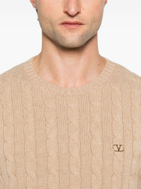 cable-knit sweater Highlights - Valentino ready to wear - Beige - Ribbed cuffs and hem - Vlogo signature Made in Italy Composition Cashmere 100% SIZE & FIT Model measurements Height 6 ft 2 in(1.87 m) Bust/Chest 37.79 in(96 cm) Hips 37.79 in(96 cm) Waist 30.31 in(77 cm) FittingInformation Designed for a relaxed fit, this piece allows for comfort and movement when worn Made with a midweight knit, this piece offers some stretch
