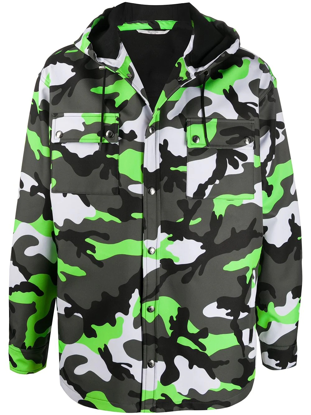 camouflage print hooded jacket Welcome to todays fashion safari and if you look to your right you might just catch a glimpse of the much lusted after camouflage print Valentino Garavani coat. Blink once and you'll miss it. Highlights - Valentino ready to wear - Dark green/fluorescent green/black/white - Cotton - Camouflage print - Drawstring hood - Press-stud fastening - Silver-tone hardware - Two front flap pockets - Two side slit pockets - Drop shoulder - Long sleeves - Curved hem - Press stud cuffs - Two internal slip pockets - Side zip fastenings Made in Italy Composition Outer: Polyester 100% Lining: Polyester 100%, Cotton 100% SIZE & FIT Model measurements Height 6 ft 1 in(1.85 m) Bust/Chest 37.79 in(96 cm) Hips 37.4 in(95 cm) Waist 30.7 in(78 cm) FittingInformation This piece fits true to size. We recommend you get your regular size Cut for a loose fit Made with a mid-weight non-stretch fabric Washing instructions Read Manufacturer Guidelines