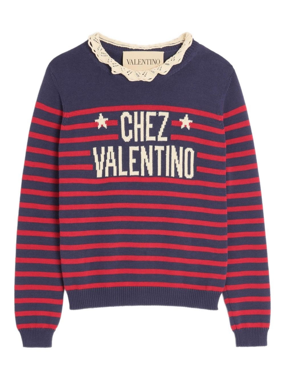 Chez sweater Highlights - Valentino ready to wear - Navy blue - Horizontal stripe pattern - Lace trim - Crew neck Made in Italy Composition Cotton 100%