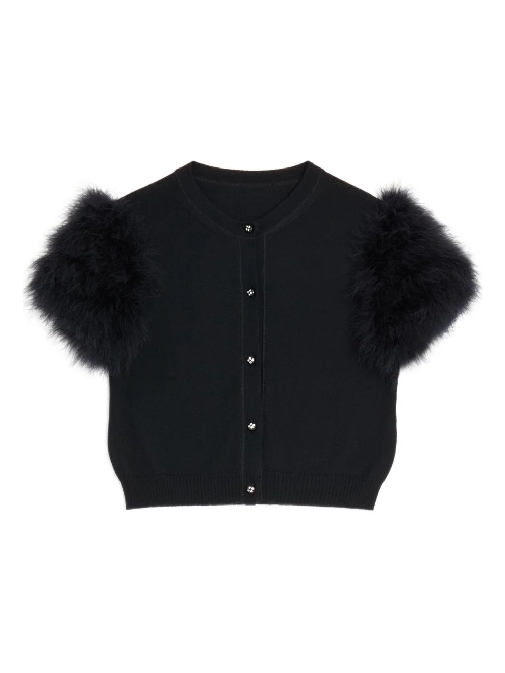 contrast-trim cardigan Highlights - Black - Front button closure - Round neck - Short sleeves - Knit construction Made in Italy Composition Virgin Wool 100%, Turkey Feather 100% Washing instructions Read Manufacturer Guidelines