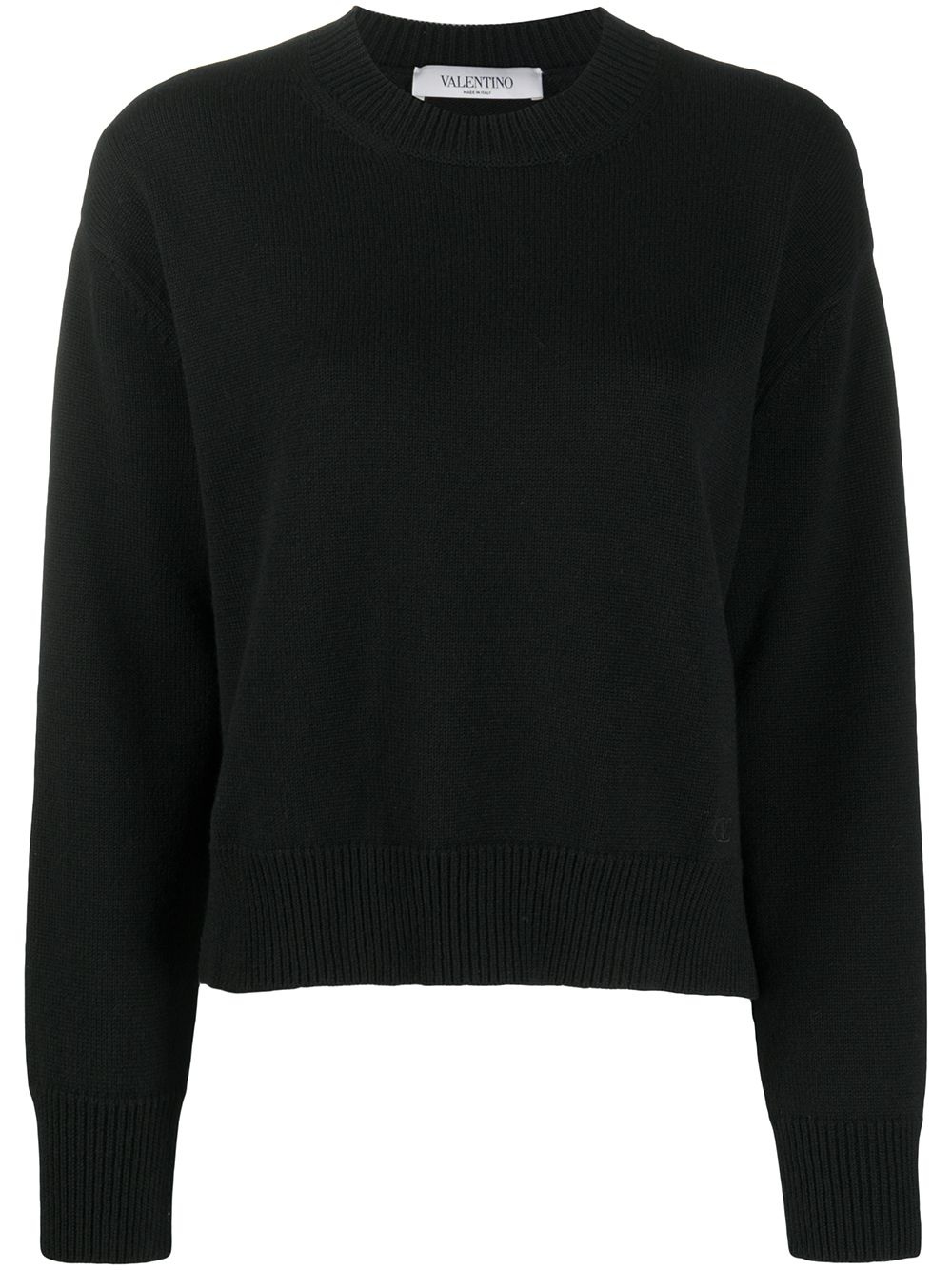 crew-neck cashmere jumper Lay the foundation to your winter wardrobe with this luxuriously soft cashmere jumper from Valentino Garavani. The relaxed fit and dropped shoulder give this piece a contemporary feel. Take it from your wishlist to the shopping basket. Highlights - Valentino ready to wear - Black - Cashmere - Ribbed-knit edge - Crew neck - Drop shoulder - Long sleeves Made In Italy Composition Cashmere 100%, Viscose 100% SIZE & FIT Model measurements Height 5 ft 11 in(1.8 m) Bust/Chest 33.07 in(84 cm) Hips 37.4 in(95 cm) Waist 25.19 in(64 cm) FittingInformation This piece fits true to size. We recommend you get your regular size Cut for a relaxed fit Made with a mid-weight fabric