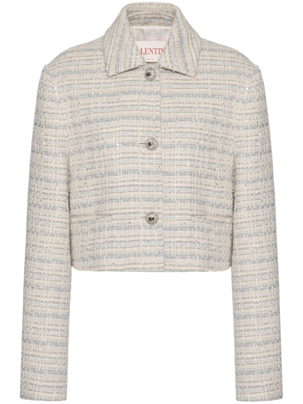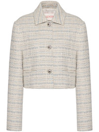Delicate tweed jacket Highlights - Ivory/grey/blue - Cotton blend - Tweed - Spread collar - Front button fastening - Embellished buttons - Long sleeves - Two side welt pockets - Straight hem - Full lining Made in Italy Composition Outer: Cotton 72%, Polyester 14%, Viscose 9%, Polyamide 5% Lining: Cupro 100%
