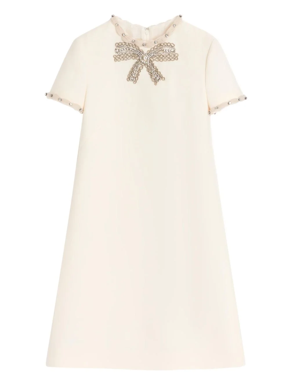 crystal-embellished mini dress Highlights - Valentino dress - Off-white - Embroidered trim detail on neckline and sleeves - Bow detailing - Rear zip closure - The full look includes valentino garavani accessories. Made in Italy Composition Virgin Wool 65%, Silk 35% Washing instructions Read Manufacturer Guidelines