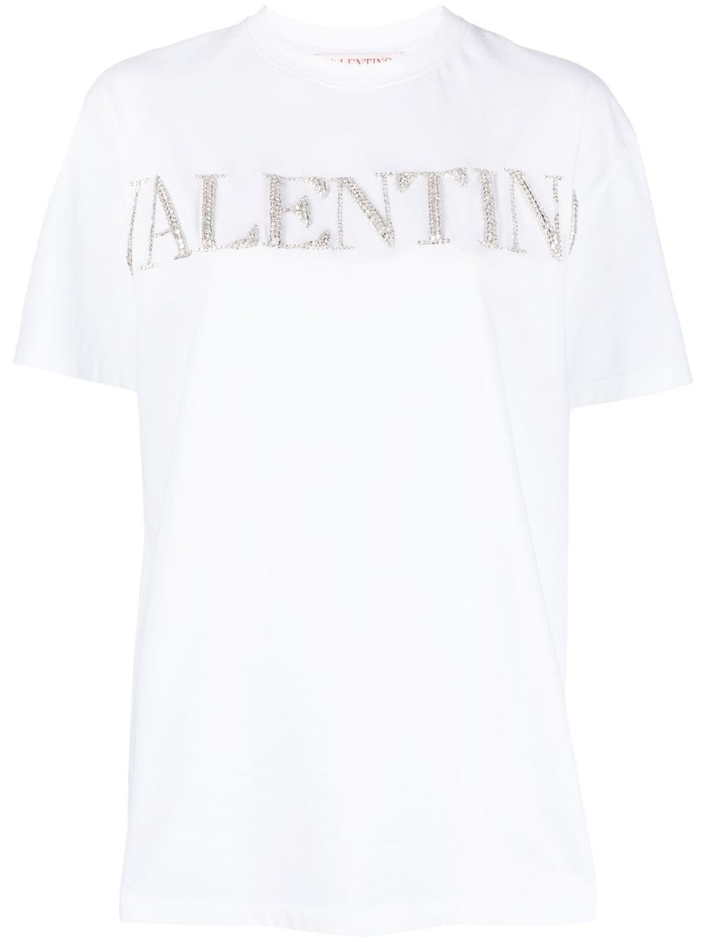 crystal-logo cotton T-shirt Valentino Garavani takes an elegant approach to branded design with this cotton-spun T-shirt, boldly embellished with a crystal logo at the front. Highlights - Valentino ready to wear - White - Cotton - Crystal embellishment - Logo lettering - Round neck - Short sleeves - Straight hem Made in Italy Composition Cotton 100%, Polyester 100% SIZE & FIT Model measurements Height 5 ft 10 in(1.78 m) Bust/Chest 30.7 in(78 cm) Hips 34.64 in(88 cm) Waist 23.22 in(59 cm) FittingInformation Designed to be unstructured, offering a loose fit throughout Made from a midweight non-stretch fabric, this piece offers minimal elasticity when worn This piece fits true to size – take your usual size Washing instructions Dry Clean Only