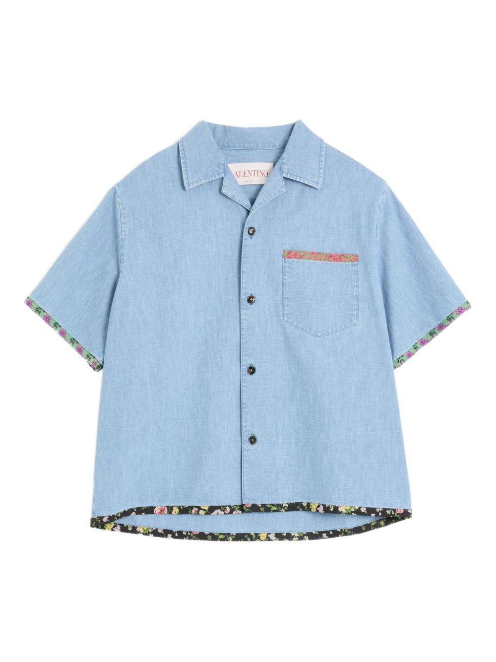 floral-trim denim bowling shirt Highlights - Light blue - Front button fastening - Chest patch pocket - Contrasting trim - Camp collar Made in Italy Composition Cotton 100%