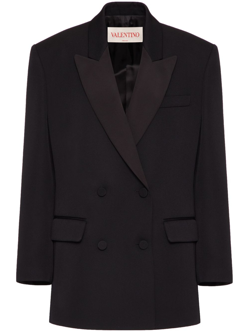 Grisaille double-breasted blazer Valentino Garavani presents a timeless design in this wool-blend blazer, evident through its effortless black tone and sophisticated double-breasted silhouette. Highlights - Valentino ready to wear - Black tie collection - Black - Virgin wool blend - Peak lapels - Double-breasted button fastening - Long sleeves - Buttoned cuffs - Straight hem Made in Italy Composition Outer: Virgin Wool 100% Lining: Cupro 100% Washing instructions Read Manufacturer Guidelines