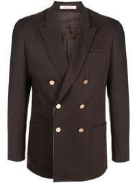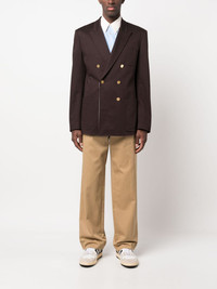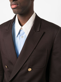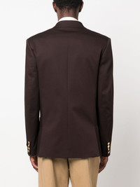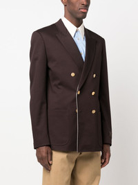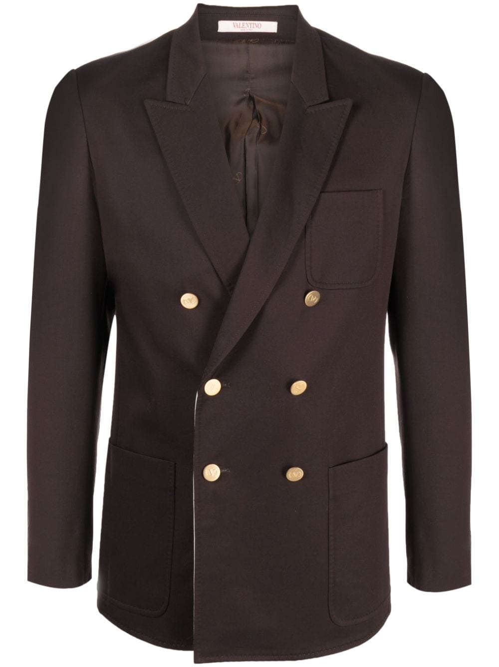 double-breasted cotton blazer Suiting expertise and hallmark branding come together in this brown blazer from Valentino Garavani, which is cut from stretch-infused cotton to a double-breasted silhouette with sharp peak lapels. A tailoring label graces the left cuff while gold-tone VLogo Signature buttons add a touch of shine. Highlights - Valentino ready to wear - Brown - Cotton blend - Peak lapels - Vlogo signature - Double-breasted button fastening - Long sleeves - Buttoned cuffs - Chest welt pocket - Two side patch pockets Made in Italy Composition Outer: Cotton 97%, Wool 63%, Viscose 37%, Spandex/Elastane 3% Lining: Cupro 100%, Polyester 100%, Polyamide 57%, Cotton 43% SIZE & FIT Model measurements Height 6 ft 0 in(1.84 m) Bust/Chest 36.22 in(92 cm) Hips 35.43 in(90 cm) Waist 26.77 in(68 cm) Measurement CHEST 40.15 in(102 cm) SLEEVE LENGTH 31.49 in(80 cm) WAIST 40.94 in(104 cm) FittingInformation Designed for a slim fit, offering a comfortable fit that sits just away from the body The vented hem offers movement at the rear Made from a midweight stretch fabric, this piece offers elasticity and flexibility when worn This piece fits true to size – take your usual size Washing instructions Read Manufacturer Guidelines