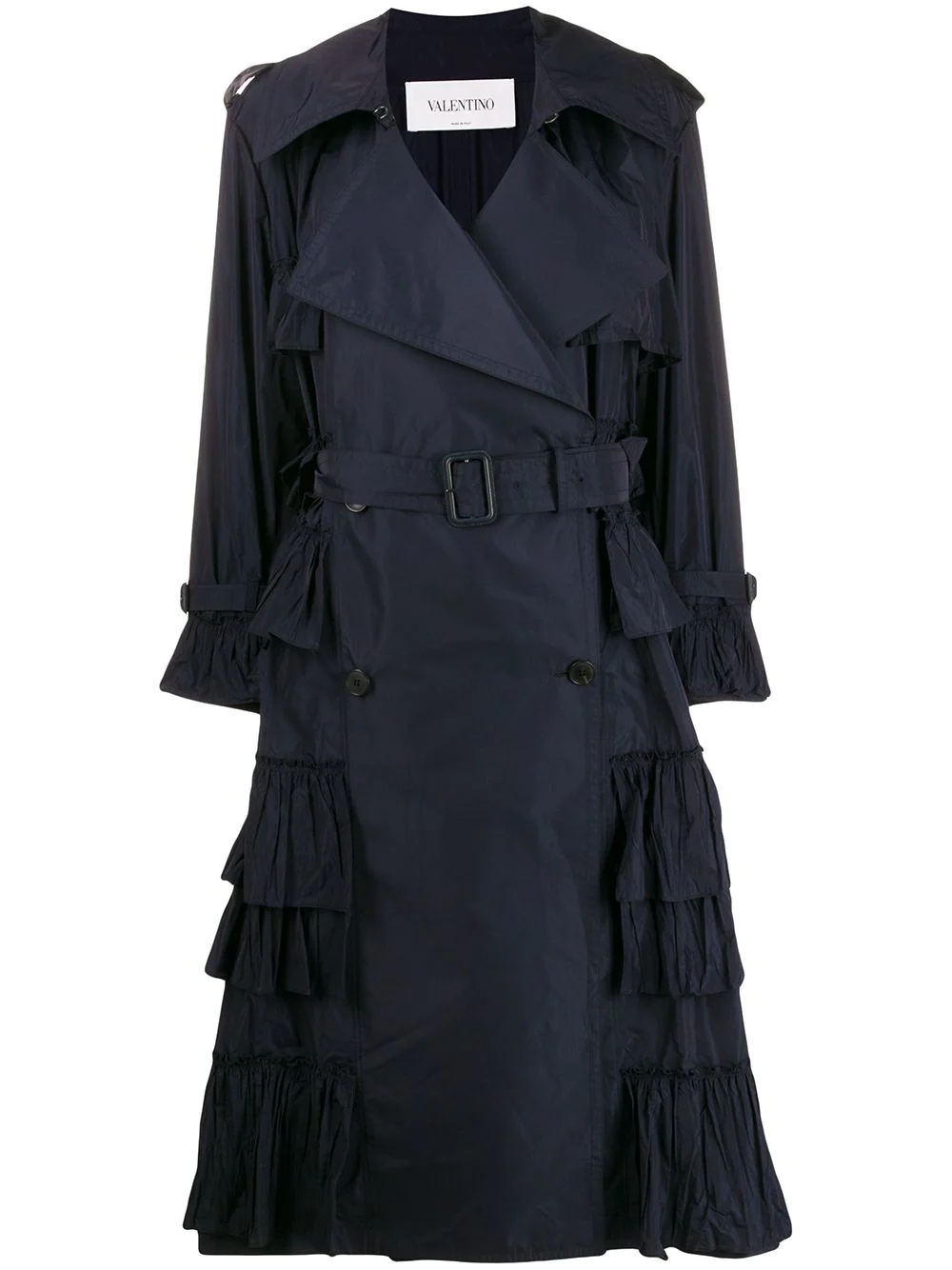 double-breasted tiered trench coat Made from ligthweight technical fabric, this navy-hued trench coat from Valentino Garavani is defined by its pleated tiered silhouette evocative of the house's craftsmanship and attention to detail. Boasting wide notched lapels, the design belts at the waist for a defined silhouette. Highlights - Valentino ready to wear - Navy blue - Wide notch lapels - Epaulettes - Double-breasted button fastening - Storm flap - Pleat detailing - Tiered Made in Italy Composition Calf Leather 100%, Polyester 100% SIZE & FIT Model measurements Height 5 ft 10 in(1.78 m) Bust/Chest 33.46 in(85 cm) Hips 36.22 in(92 cm) Waist 23.22 in(59 cm) FittingInformation This piece fits true to size. We recommend you get your regular size Cut for a relaxed fit Made with a mid-weight non-stretch fabric Washing instructions Dry Clean Only