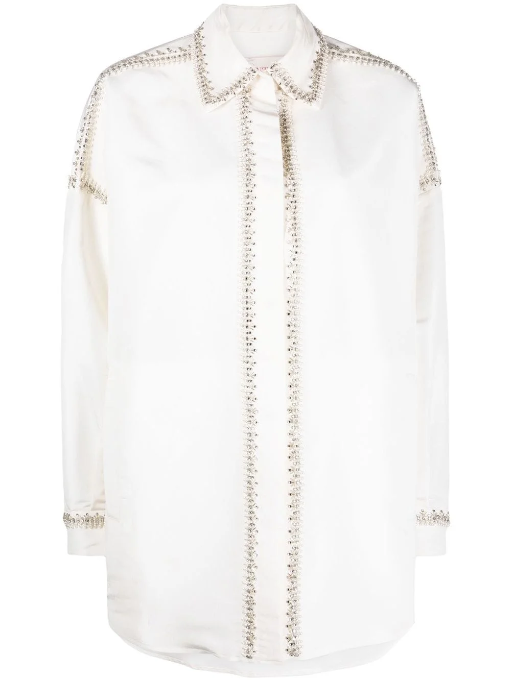embellished-trim long-sleeve shirt Trimmed with delicate bead embellishment, this long-sleeve shirt exhibits the brand's penchant for classic styles reimagined through a modern lens. Highlights - Valentino ready to wear - White - Buckle-embellished shoulder straps - Drop shoulder - Long sleeves - Classic collar - Concealed front fastening Made in Italy Composition Outer: Silk 100% Lining: Polyester 100% Washing instructions Read Manufacturer Guidelines