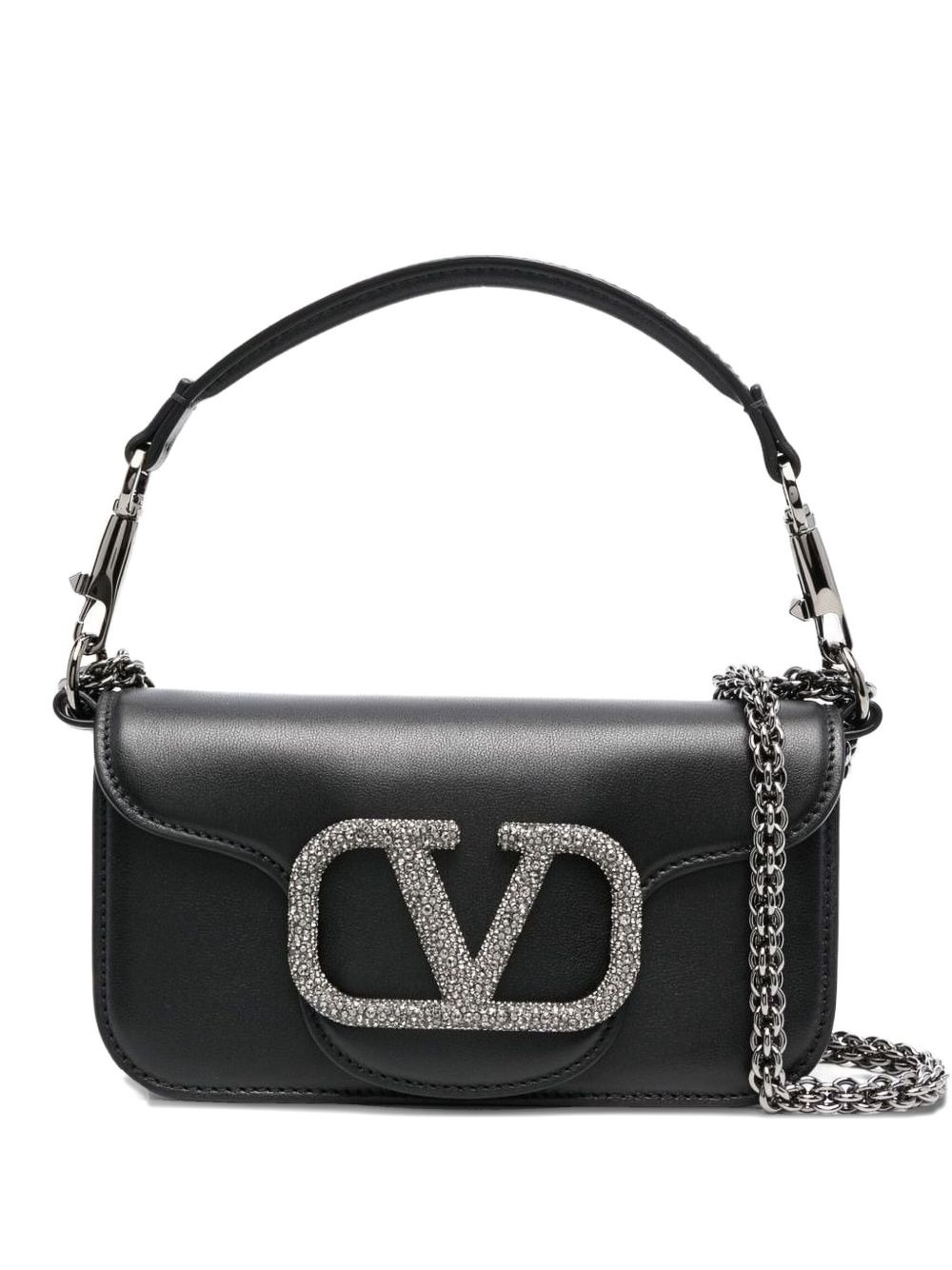 small Loco shoulder bag Inspired by the style of the 1970s, Valentino Garavani's VLogo Signature is given an embellished update to adorn the front of this calf leather Loco shoulder bag. Highlights - Black - Calf leather - Swarovski crystal-embellished maxi vlogo signature - Leather and chain-link shoulder strap - Foldover top with magnetic fastening - Main compartment - Internal slip pocket Made in Italy Composition Lining: Lambskin 100%, Calf Leather 100% Outer: Metal 100%, Crystal 100%, Silk 100%, glass 100%, Lambskin 100%, Polyester 100%, Polyamide 100% SIZE & FIT Measurement DEPTH 1.96 in(5 cm) HEIGHT 4.33 in(11 cm) WIDTH 7.87 in(20 cm)