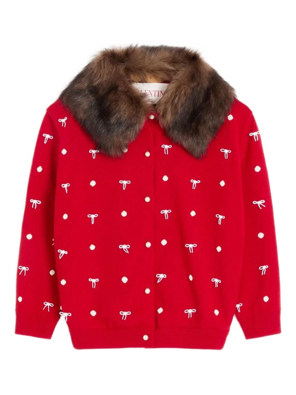 embellished wool cardigan Highlights - Red - Virgin wool - Front button fastening - Fur collar - Bow detailing - Ribbed cuffs and hem - The model is 176 cm / 5'9'' tall and wears an italian size s Made in Italy Composition Outer: Virgin Wool 100%, Polyester 100%, Cotton 100%, Lamb Fur 100% Lining: Acetate 75%, Silk 25% Washing instructions Specialist Cleaning