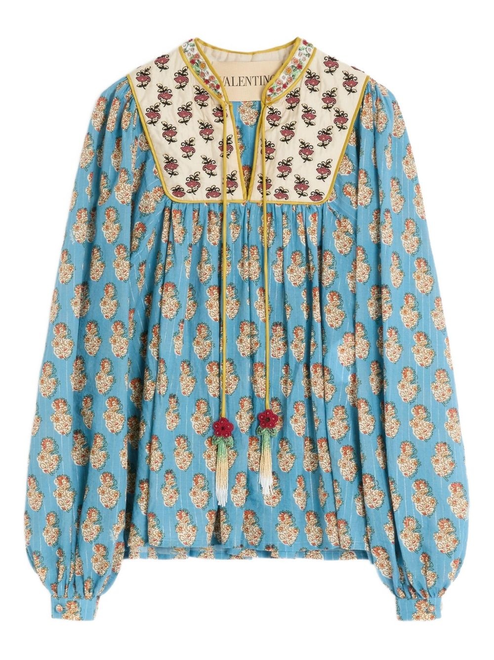 Petales d'Amour-print lurex top Highlights - Light blue - V-neck - Self-tie fastening - Panelled design - Long puff sleeves Made in Italy Composition Cotton 99%, Lurex 1% Washing instructions Read Manufacturer Guidelines