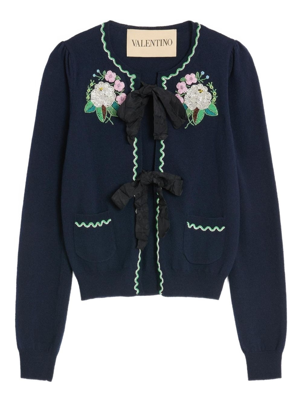 embroidered cardigan Highlights - Navy blue - Floral embroidery - Gathered bow detail - Contrasting trim - Button fastening Made in Italy Composition Virgin Wool 100% Washing instructions Read Manufacturer Guidelines