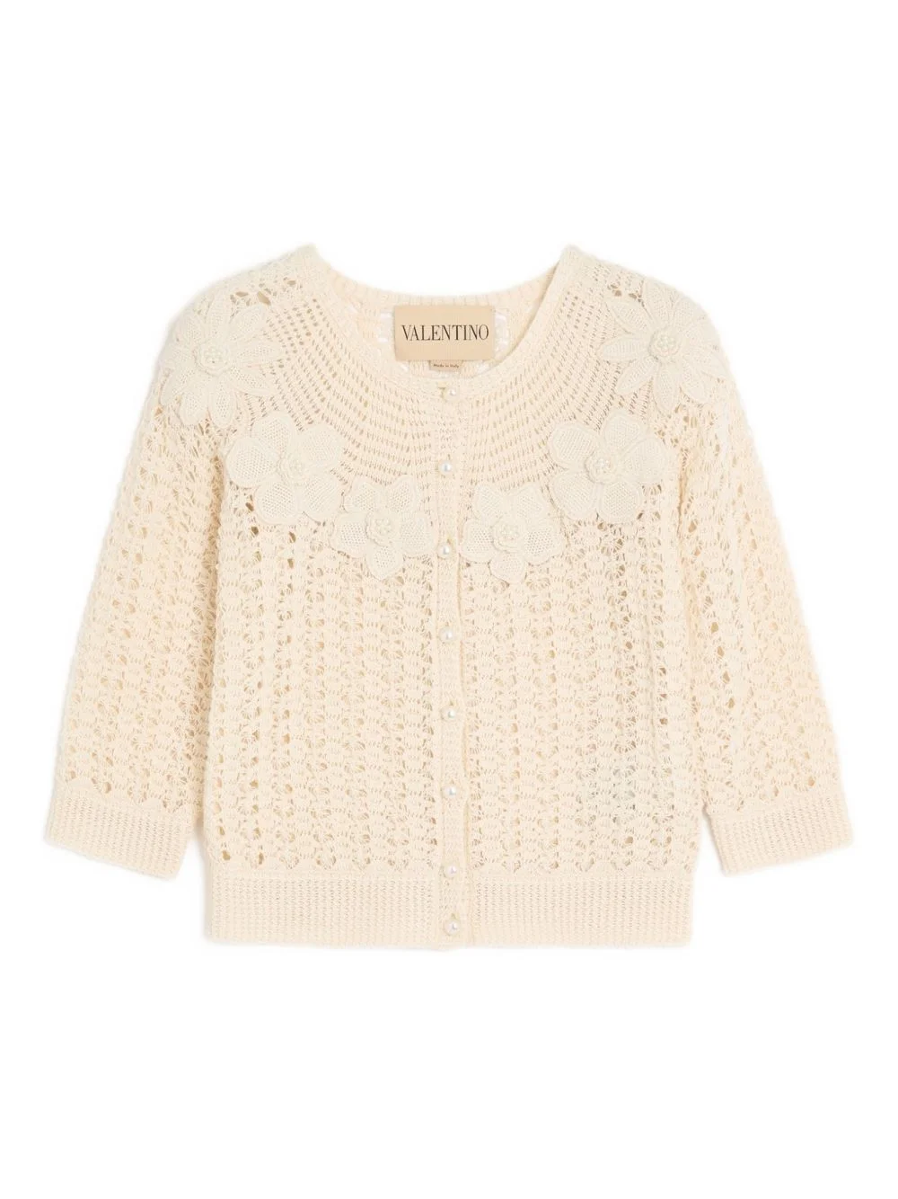 embroidered crochet-flower cardigan Highlights - Valentino cardigan - Cream - Embroidered crochet flowers - Bead embellishment - Front button closure - Three-quarter sleeves - Open knit design - The full look includes valentino garavani accessories. Made in Italy Composition Cotton 100% Washing instructions Read Manufacturer Guidelines