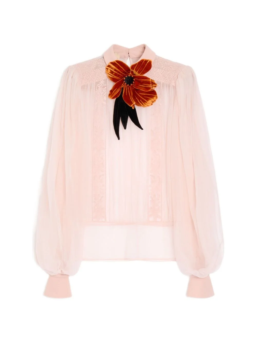 Embroidered Organza Top Highlights - Organza top with embroidered velvet flower - cady couture collar and cuffs - lace inlay - back button closure - organza (100% silk) - georgette stretch slip (91% silk, 9% elastane) - length: 68 cm / 26.7 in. from the shoulders in an italian size 40 - the model is 176 cm / 5'9" tall and wears size 40 Made in Italy Composition Silk 100% Washing instructions Read Manufacturer Guidelines