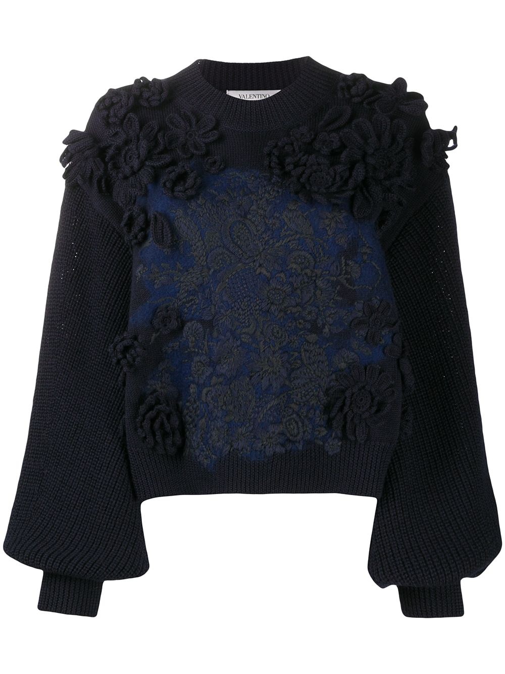 embroidered wool jumper Add some signature blooms to your knitwear with this embroidered wool jumper from Valentino Garavani. Designed with Bluegrace raised floral embroidery to the front and long balloon sleeves, this chunky knit is sure to elevate your ensemble. Highlights - Valentino ready to wear - Navy blue - Virgin wool - Knitted construction - Bluegrace raised floral embroidery - Crew neck - Balloon sleeves - Ribbed trim Made in Italy Composition Virgin Wool 200%, Wool 100%, Acrylic 100% SIZE & FIT Model measurements Height 5 ft 10 in(1.78 m) Bust/Chest 31.49 in(80 cm) Hips 36.22 in(92 cm) Waist 25.59 in(65 cm) Washing instructions Dry Clean Only