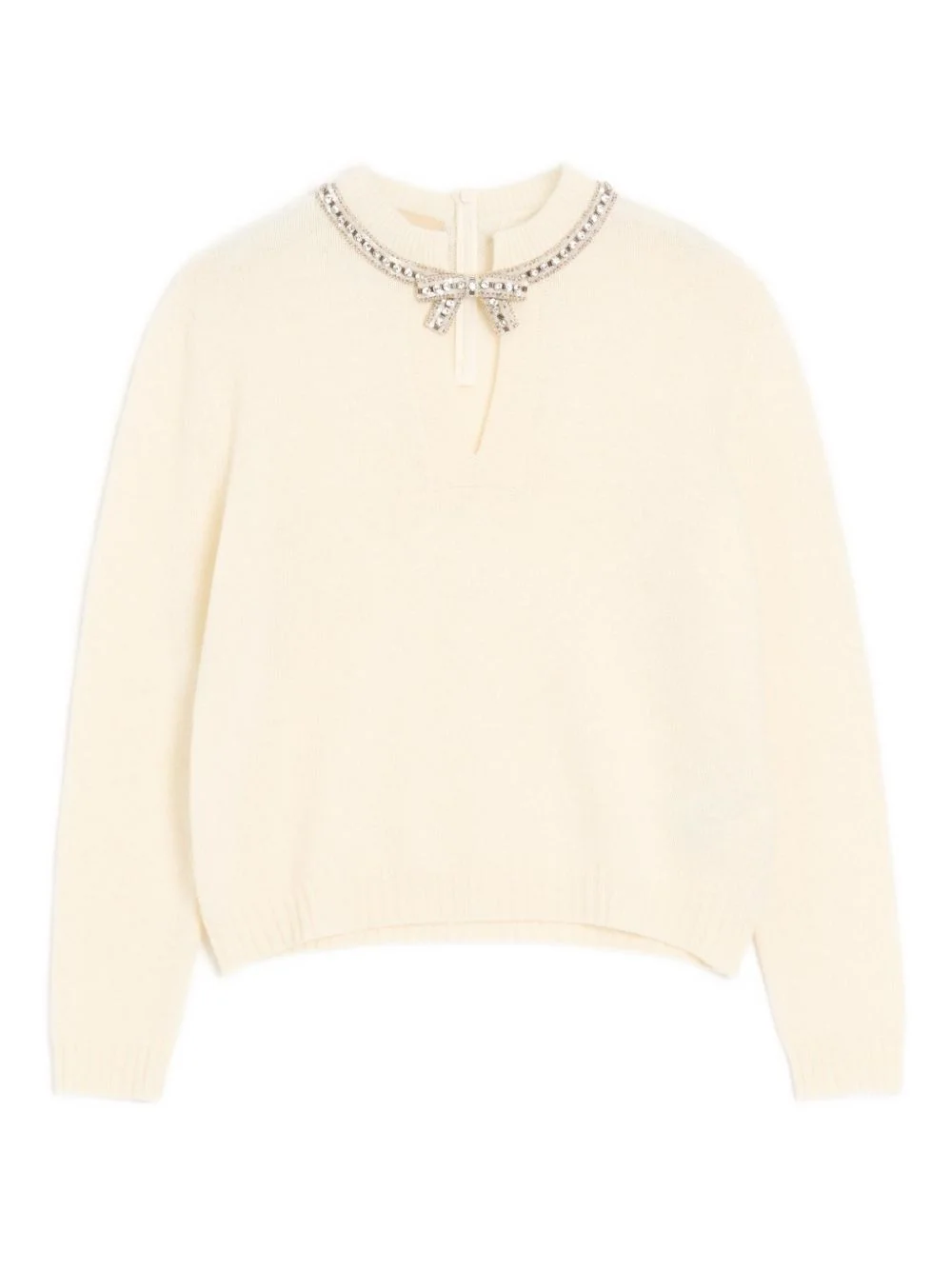 embroidered wool jumper Highlights - Valentino jumper - Off-white - Crew neck - Embroidered rhinestone bow - Long sleeves - Zip fastening - The full look includes valentino garavani accessories. Made in Italy Composition Virgin Wool 100% Washing instructions Read Manufacturer Guidelines